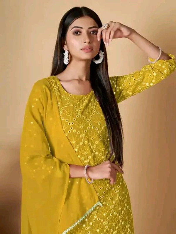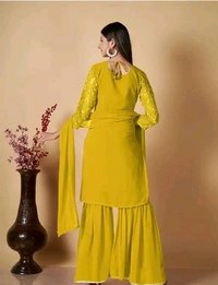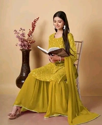 The sharara-style bottoms paired with the elegantly crafted kurti and flowing dupatta create a harmonious silhouette that flatters every body type. Whether you're attending a grand celebration or a casual gathering, this set guarantees you'll turn heads with its exquisite detailing and stunning craftsmanship.