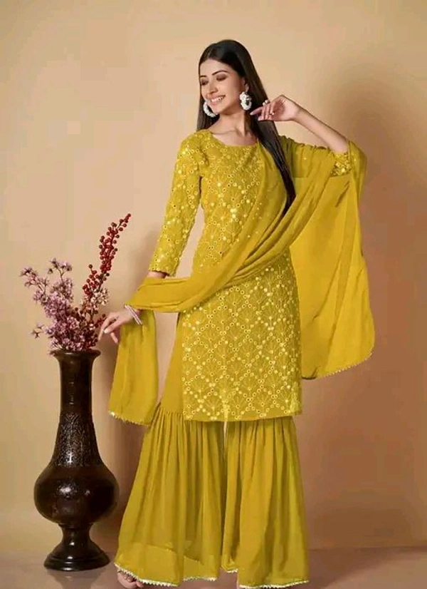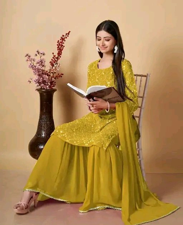 This Georgette Sharara Kurti and Dupatta Set is versatile enough to suit a variety of occasions. Pair it with statement jewelry and heels for a complete look that radiates confidence and beauty.